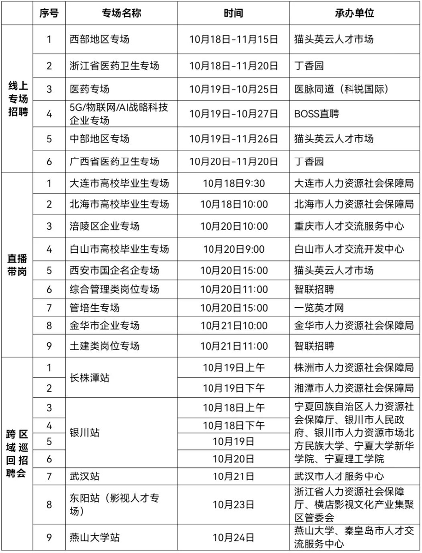線上活動15場:包括醫(yī)藥、5G/物聯(lián)網(wǎng)/AI戰(zhàn)略科技企業(yè)、西部地區(qū)、浙江省醫(yī)藥、中部地區(qū)、廣東省醫(yī)藥等6場線上專場招聘會和9場直播帶崗。截至10月14日,已有2174家用人單位提供約4.7萬個崗位,后期將有更多用人單位陸續(xù)加入。